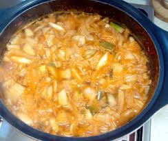 육수가 끓으면 김치와 김치국물을 넣고 센불에서 5분간 끓입니다 ※ 이때 새우젓 0.5작은술을 넣으면 감칠맛이 살아나요