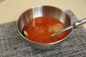 국물에 사과즙 또는 배즙, 식초, 설탕, 국간장, 다진 마늘을 넣고 골고루 섞습니다 기호에 따라 겨자 약간을 풀어도 좋습니다