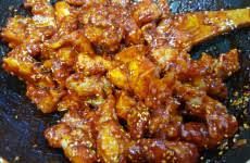 튀긴 닭을 팬에 넣고 불을 끈 상태에서 소스와 고루 섞어주세요. 센 불에서 하면 눌 수 있으니 주의!