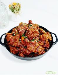 돼지갈비를 푹 삶아 잡내를 없애고 고춧가루, 고추장, 마늘, 간장 등으로 매콤달콤하게 양념해 자작하게 조려낸 찜 요리입니다 감자, 당근, 양파 등을 함께 넣으면 더욱 푸짐하고 깊은 맛이 납니다
