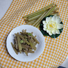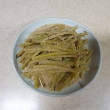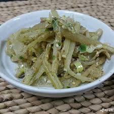 머위대는 껍질을 벗긴 후, 끓는 물에 2분간 데쳐서 찬물에 식힌 뒤 5~6cm 길이로 썰어줍니다.