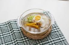 오이, 배는 얇게 채 썰고, 무는 길게 썬 절임무로 준비합니다. 삶은 계란은 반으로 자르고, 기호에 따라 소고기 편육도 곁들일 수 있어요.