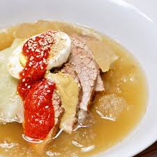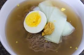 오이, 배는 얇게 채 썰고, 무는 길게 썬 절임무로 준비합니다. 삶은 계란은 반으로 자르고, 기호에 따라 소고기 편육도 곁들일 수 있어요.