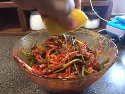 양파, 오이, 고추, 미나리 등의 채소와 함께 고추장·식초·설탕 양념장에 버무리면 병어회무침 완성!