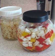 병에 양파, 고추를 차곡차곡 담고 식힌 피클 국물을 부어줍니다. 재료가 잠기도록 해야 해요.