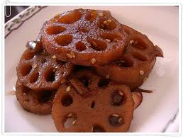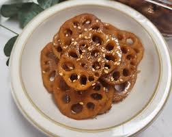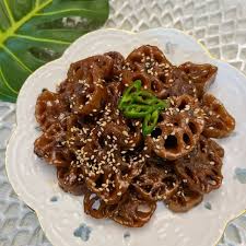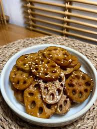 1) 연근을 얇게 썰어 간장, 물엿, 설탕 등으로 졸여낸 달콤짭짤한 밑반찬
