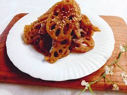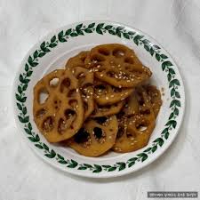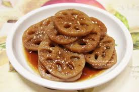 1) 연근을 얇게 썰어 간장, 물엿, 설탕 등으로 졸여낸 달콤짭짤한 밑반찬