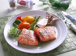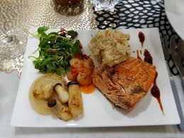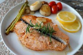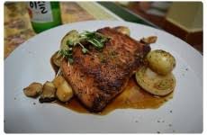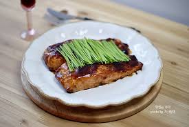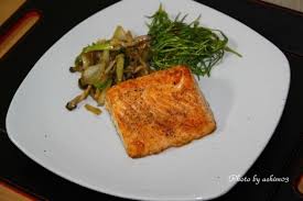1) 연어 필렛을 팬에 구워 겉은 바삭, 속은 부드럽게 익힌 요리