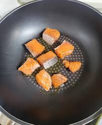 중약불에서 팬을 달군 후 연어를 앞뒤로 살짝 노릇하게 굽습니다. 이 과정으로 비린내 제거와 고소함을 살립니다.