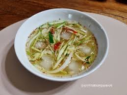 국물에 절인 오이와 채썬 양파를 넣고 잘 섞어줍니다. 얼음도 함께 넣어 시원함을 더하세요!