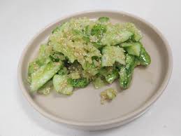 오이에 양념장을 넣고 가볍게 버무린 뒤, 참기름, 깨소금을 넣어 마무리합니다.