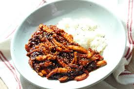 - 재워둔 오징어와 양념장을 넣고 센 불에서 빠르게 볶아줍니다. 너무 오래 볶으면 질겨지므로 주의합니다.