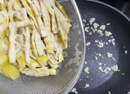 기름에 다진 마늘을 살짝 볶아 향을 낸 뒤 죽순을 넣습니다.