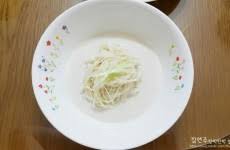 소면을 끓는 물에 삶은 후 찬물에 여러 번 비벼 헹궈 전분기를 제거하고 얼음물에 넣어 완전히 식힙니다