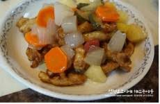 돼지고기 등심이나 안심을 사용하며, 지방과 힘줄을 제거하고 한입 크기로 썹니다 잡내 제거를 위해 소금, 후추로 밑간하고 약간의 맛술을 섞어 10분간 재워둡니다