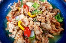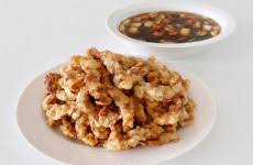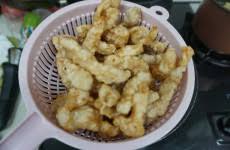 를 섞어 반죽을 만듭니다 이때 반죽은 걸쭉하게 하여 고기에 잘 붙도록 해야 하며, 고기에 전분을 먼저 살짝 묻힌 후 튀김반죽을 입히면 더욱 바삭해집니다